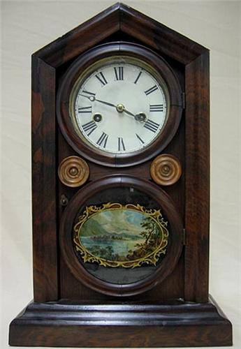 Walnut cased hourglass clock; maker's label missing on back; spring wind; scenic decoration on glass; working; pat. Date 1878; 16" x 10 1/2" (no visible defects)