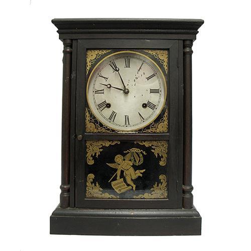 Walnut cased shelf clock with overhanging cornice; painted dial behind gilt decorated glass door; flanked by side columns; with key and pendulum; 19th C.; 18" high x 11 1/4" across x 4 1/4" deep; some paint loss on dial and glass