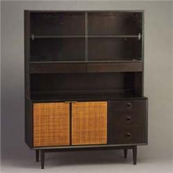 Walnut china cabinet with two sliding glass doors over two drawers (one fitted for silverware), woven rush hinged doors enclosing one adjustable shelf, and three drawers. Some staining, minor veneer chips. Unmarked. 68" x 52" x 18 1/4" $400-600