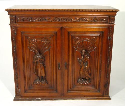 Walnut cupboard heavily carved with swag frieze and two medieval figures to the doors enclosing shelves, 106cm high, 116cm wide, 43cm deep