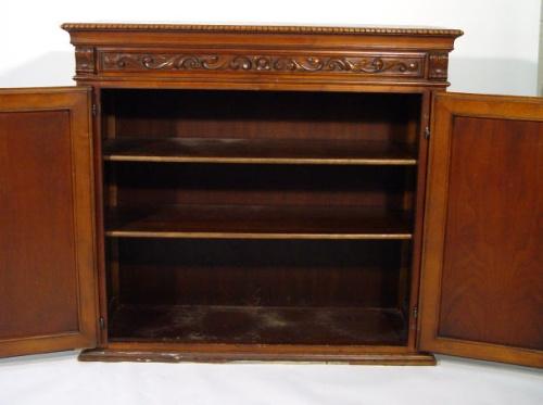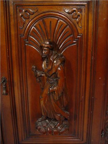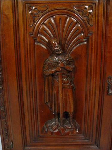Walnut cupboard heavily carved with swag frieze and two medieval figures to the doors enclosing shel