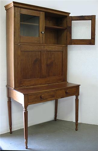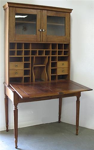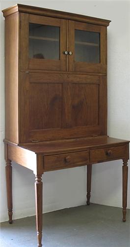 Walnut drop front desk; molded cornice over double glass doors above recessed paneled door; opens to become writing surface; interior pigeon holes; on base with two short drawers; eight sided legs with ringed decoration on top and ankles; peg and ball feet; 19th C.; measures 78" high x 41" across x 23" deep (no visible defects)