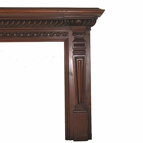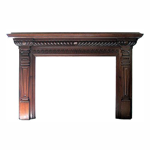 Walnut fireplace mantle; molded overhanging cornice over gadrooned decoration; above stylized rosettes; side columns with capital over square tapering; C.1900; 50" high x 77 1/2" across x 9 1/2" deep (some wear)