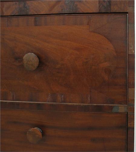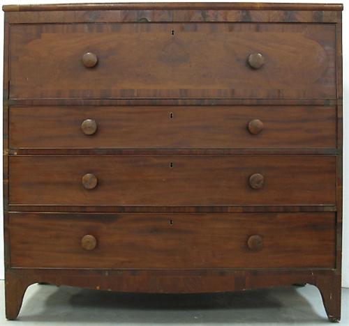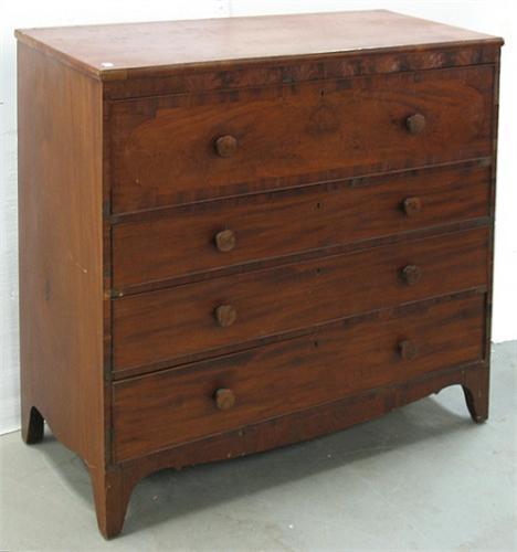 Walnut four drawer chest; rectangular top over four long drawers; the large top drawer with inlaid banded veneer; knob handles; beaded drawer fronts; dovetailed drawer construction; bracket feet; early 1800's; 44" high x 46 1/2" across x 21" deep (top with crack)