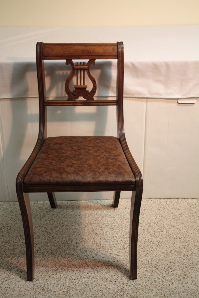A set of four Walnut chairs with carved wooden harps on the backs. Buy one, take all.