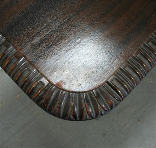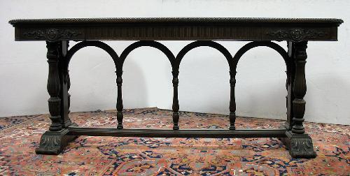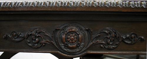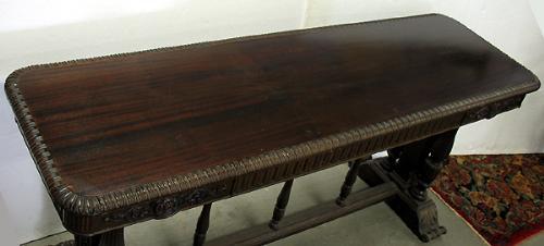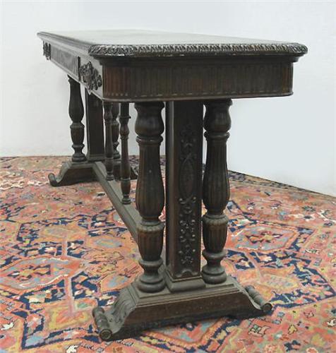Walnut library table; carved banding around overhanging top; carved and applied decoration on apron; two reeded columns flank each support ending in scroll feet; and three baluster carved legs attach to stretcher; C.1920; 30" high x 6' x 20" (no visible defects)