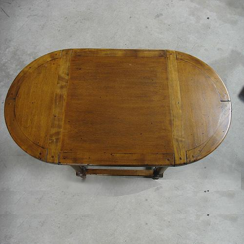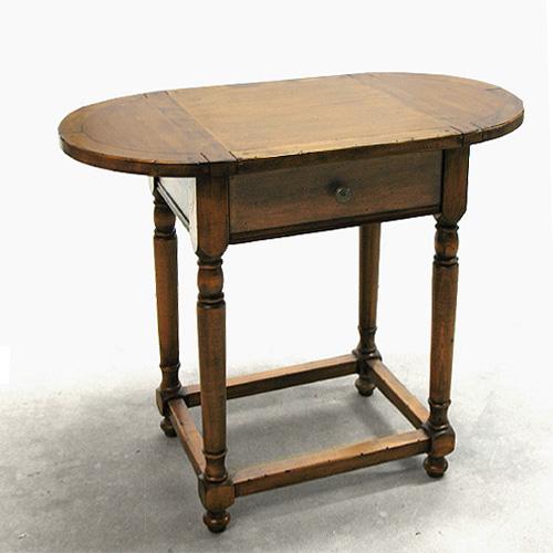 Walnut one drawer stand; oval top over one drawer; four turned legs with box stretcher; ending in ball feet; label under top "Made in Italy"; 29" high x 35 1/2" across x 19 3/4" deep (no visible defects)