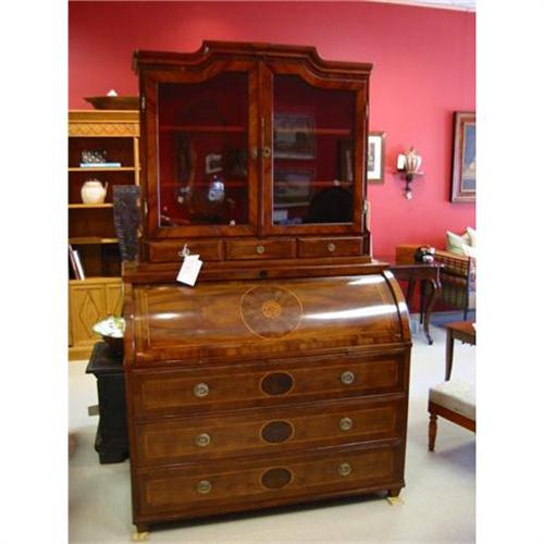 The desk is walnut veneer on pine with rich inlay and detail work. Its provenance is Vienna. The mechanism for opening the top are two wooden wheels that invert the roll top portion to reveal beautiful inside details. Secret shelves behind small drawers and cubbies. The artisan that made this exceptional piece of furniture was clearly trying to impress with his ability to manipulate the wood. On all sides of this desk are details, inlay and carving.