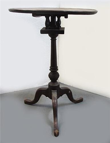 Walnut tilt top table; dish top over bird cage; ring turned standard; on three feet; 19th C.; measures 28" high x 20 1/2" diameter (split on top)