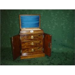 Walnut veneered jewellery cabinet fitted with three drawers and cupboard