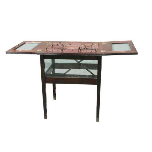 Walnut with Glass Fold Out Bar, insert to hold bottles and glasses. 45 1/2 inches opened and 23 X 28 X 20 inches closed.