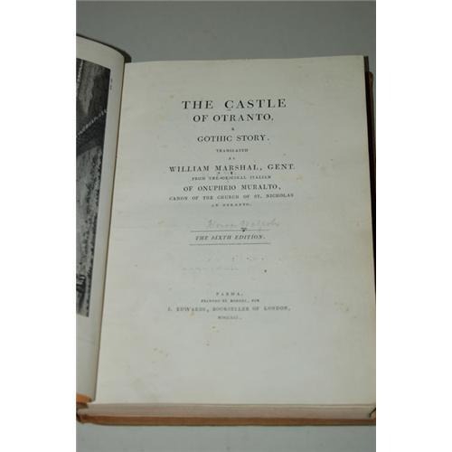 Walpole, Horace. The Castle of Otranto, A Gothic Story. Parma: Printed By Bodoni for J. Edwards, 1791. 8vo - over 7¾" - 9¾" tall. Hard Cover. Ex-Library. Good Condition. Sixth Edition. Translated by William Marshal, Gent. from the Original Italian of Onuphrio Muralto. Half-title, frontis, title, xxxii, 245pp, bound in buckram with red leather spine label. Slight bow to covers, occasional foxing, free endpapers detached, book restitched, binding & hinges tight