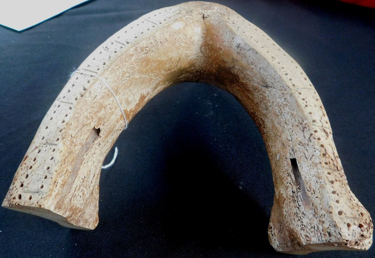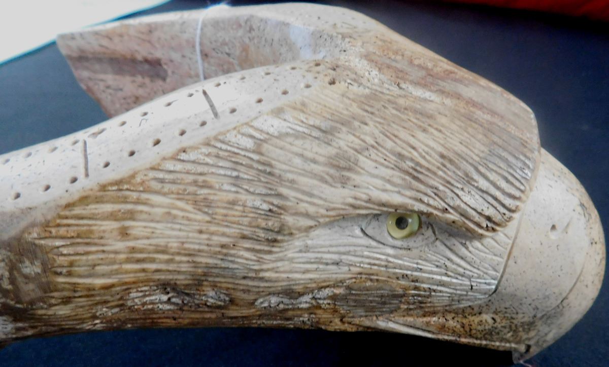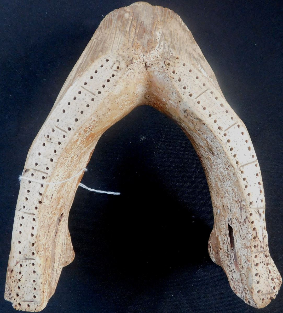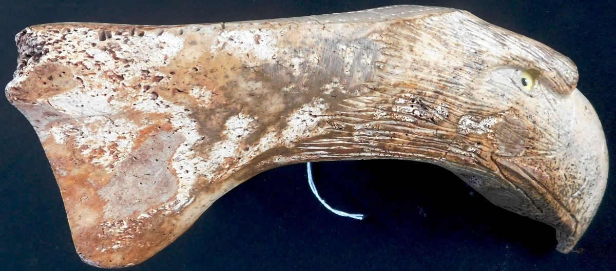 Walrus Bone Cribbage Board, carved in the 1940s. Made of walrus bone and glass eyes. Item measures 9.5" x 7" x 4", from western Alaska, USA. Carved in the shape of an eagle head, this item is made from a walrus jaw bone. It may even be a fossil bone. Condition: Good, see images. Shipping: $24.