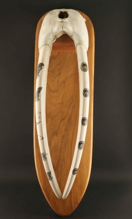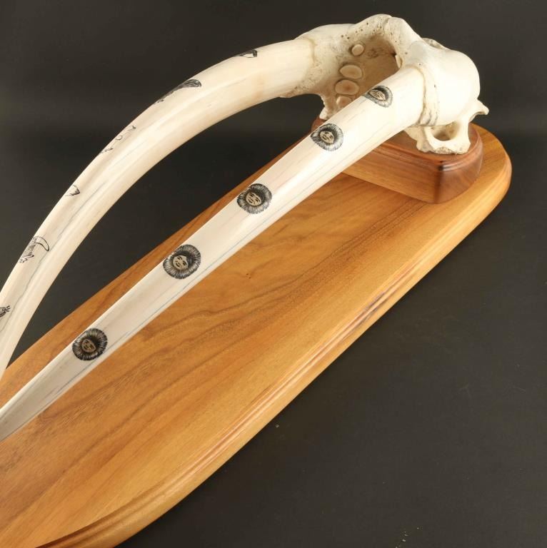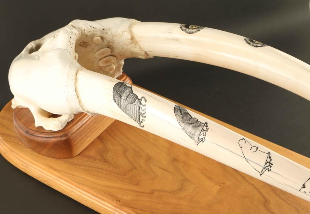 Jaw bone with tusks displaying Eskimo and wildlife scrimshaw. Mount alone measures 28"l on wood base that measures 31"l x 9"w. Tip of left tusk has chip otherwise very good.