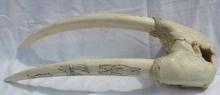 Very rare and unusual scrimshawed Walrus tusks beautifully hand carved and signed by an Eskimo artist with his registered number also carved into the tusks. The number makes them legal to own. Only the Eskimo people have the right to hunt Walrus and do the scrimshaw work on the tusks. The length is approx. 15” Long. Can ship in the U.S. only.