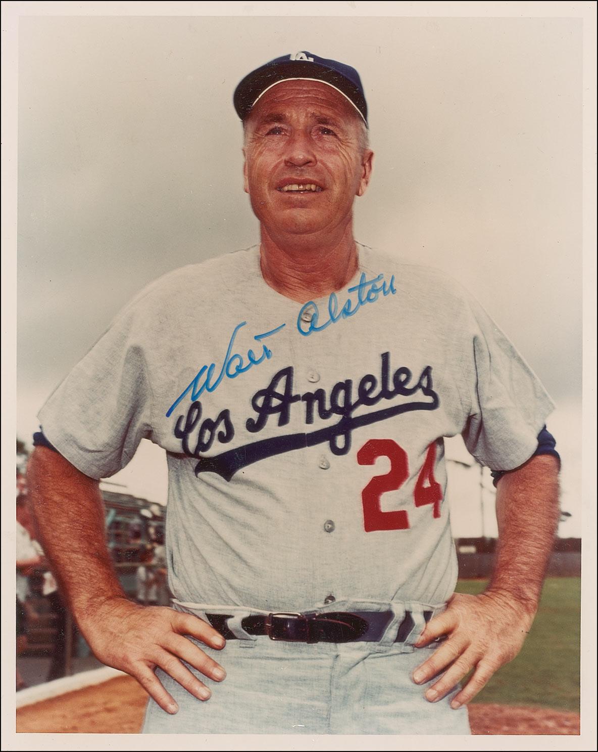 Color satin-finish 8 x 10 photo of Alston in his Los Angeles Dodgers uniform, signed in blue felt tip. In fine condition, with a few creases, surface impressions, and light stains.
