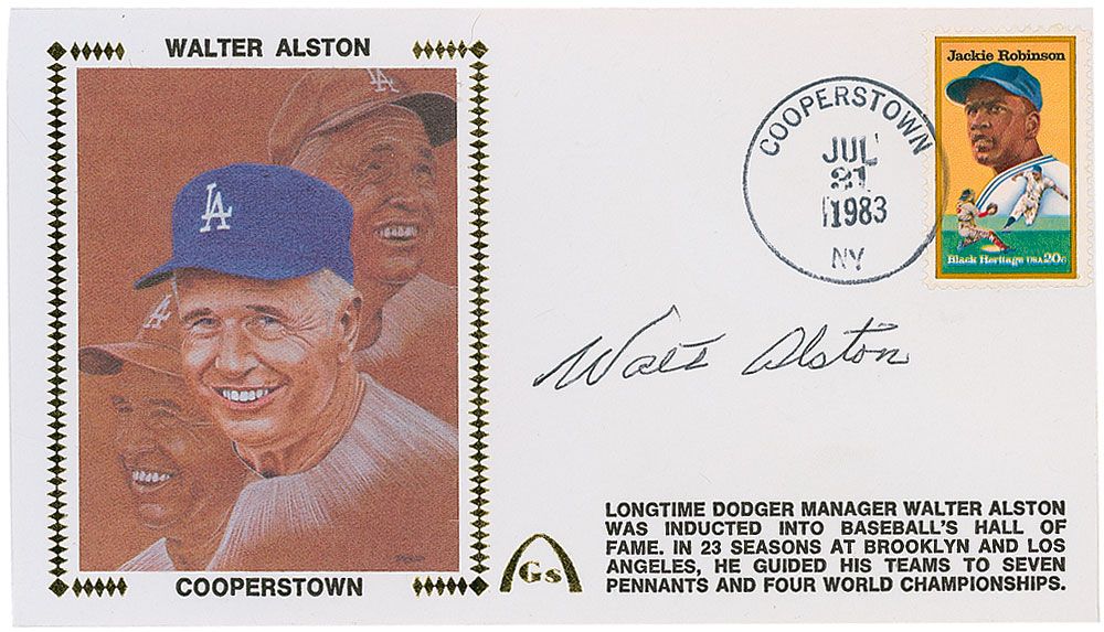 Gateway commemorative cover, 6.5 x 3.75, bearing a color silk cachet honoring Alston’s 1983 election into the Hall of Fame, signed on the front in black ballpoint. In very fine condition. Alston passed away in 1984, giving him only a one year window to sign these covers.