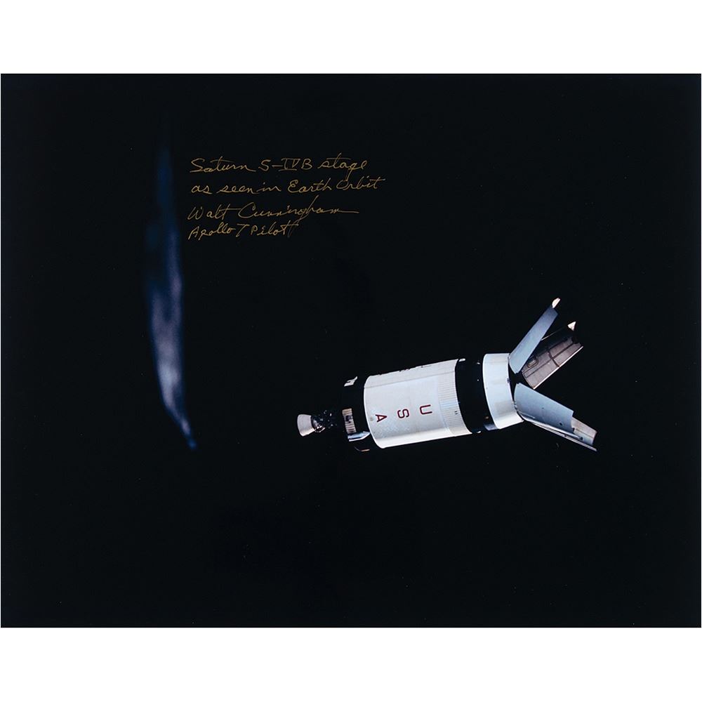 Color glossy 20 x 16 photo of the S-IVB rocket stage in orbit as seen from the Apollo 7 spacecraft, signed in gold ink, "Saturn S-IVB stage as seen in Earth Orbit, Walt Cunningham, Apollo 7 Pilot." In fine condition.