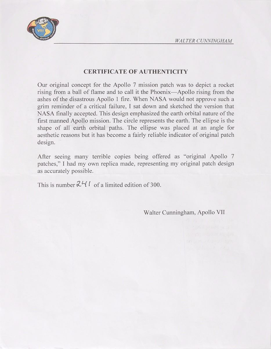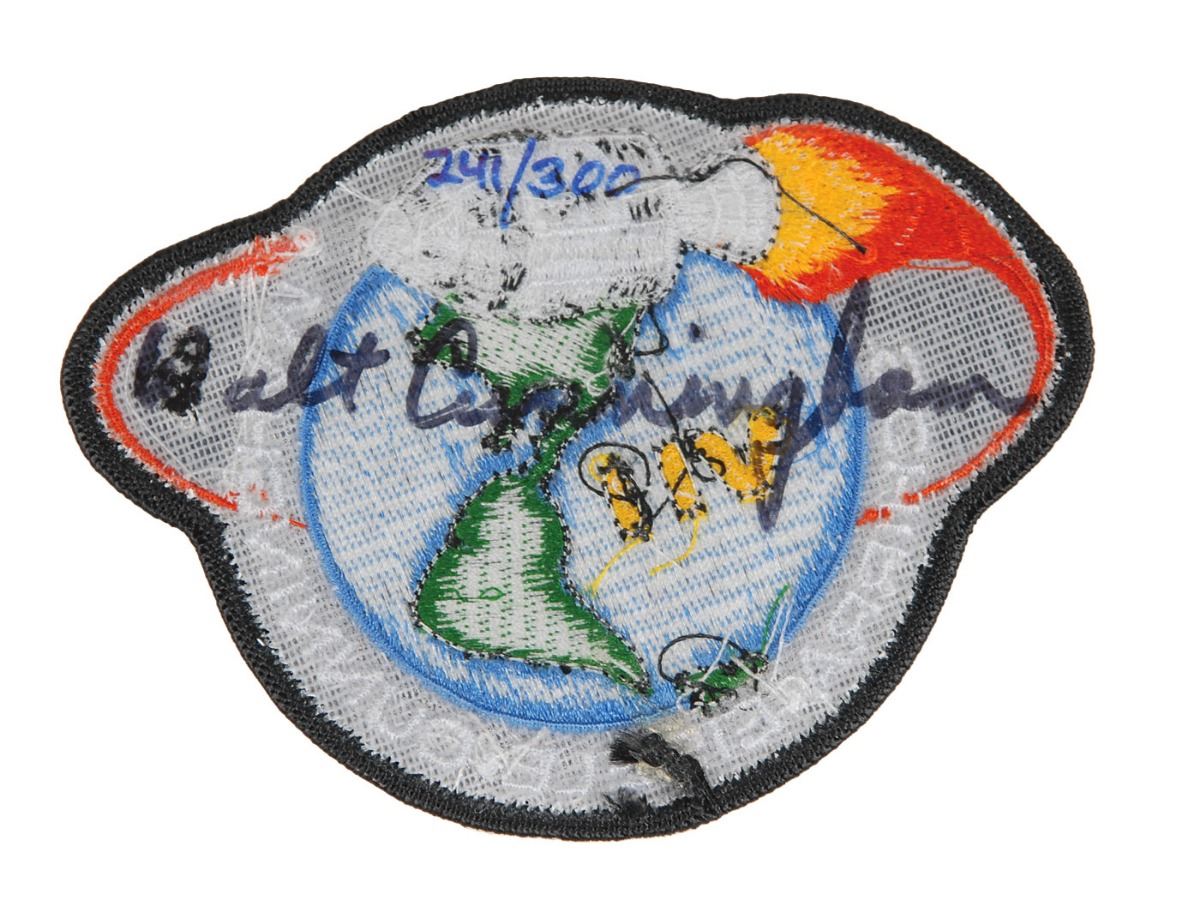 Limited edition embroidered Apollo 7 mission patch, measuring approximately 4.25 x 3.25, numbered 241/300, signed on the reverse in black felt tip by Cunningham. In fine condition. Accompanied by a certificate of authenticity describing the history of the patch and its design.