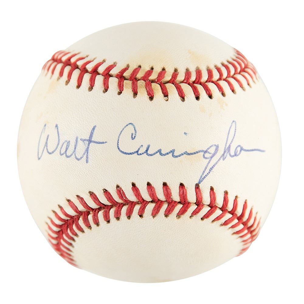 Official Rawlings American League (Brown) baseball signed in blue ballpoint on the sweet spot, "Walt Cunningham." In fine condition, with scattered small stains. Cunningham was the Lunar Module Pilot of the Apollo 7 mission.