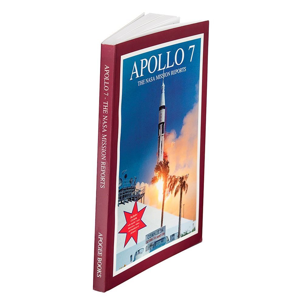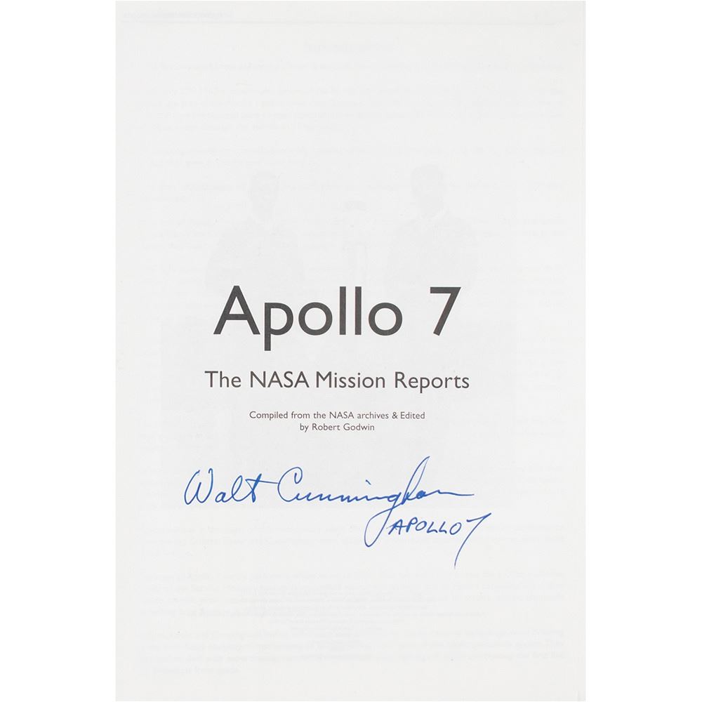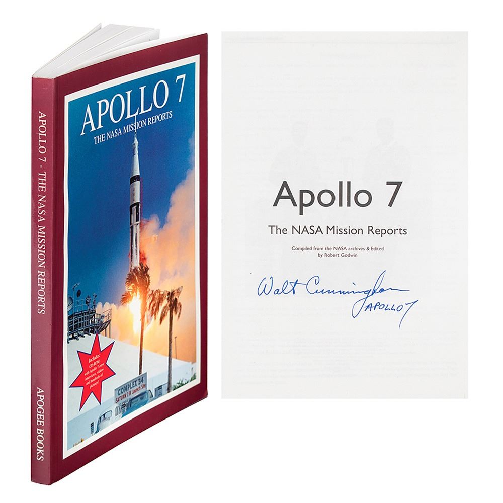 Signed book: Apollo 7: The NASA Mission Reports. Burlington, Ontario: Apogee Books, 2000. Softcover with CD-ROM, 7 x 10, 272 pages. Signed on the title page in blue felt tip, "Walt Cunningham, Apollo 7." In fine condition.