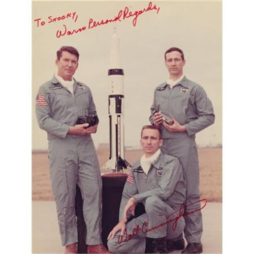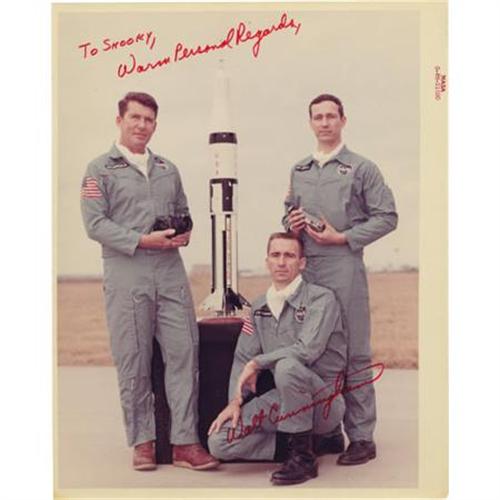 <B>Walt Cunningham Signed Color Photograph,</B></I> 8" x 10", "<I>To Snooky,/ Warm Personal Regards,/ Walt Cunningham.</B></I>" Snooky is Joe Garino's wife, Dorothy who had, at times, sewn the patches on various astronauts' flight suits, including Cunningham's. Pictured is the Apollo 7 crew. <I>From the collection of renowned former physical trainer of the astronauts Joe Garino. This lot is accompanied by a signed certificate of authentication from Garino verifying its provenance.</B></I><BR><BR><b>Shipping:</b> Flat Material, Small (<a target="_blank" href="http://www.heritageauctions.com/common/shipping.php">view shipping information</a>)