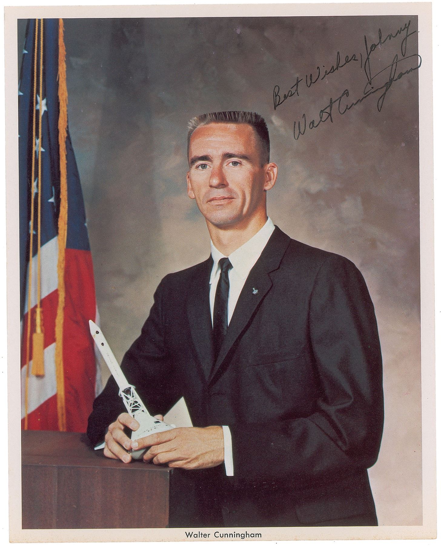 Official color 8 x 10 NASA lithograph of the Apollo 7 LMP posing with a capsule model, signed and inscribed in black felt tip, "Best wishes, Johnny, Walt Cunningham.” In fine condition, with a few small spots to the surface.