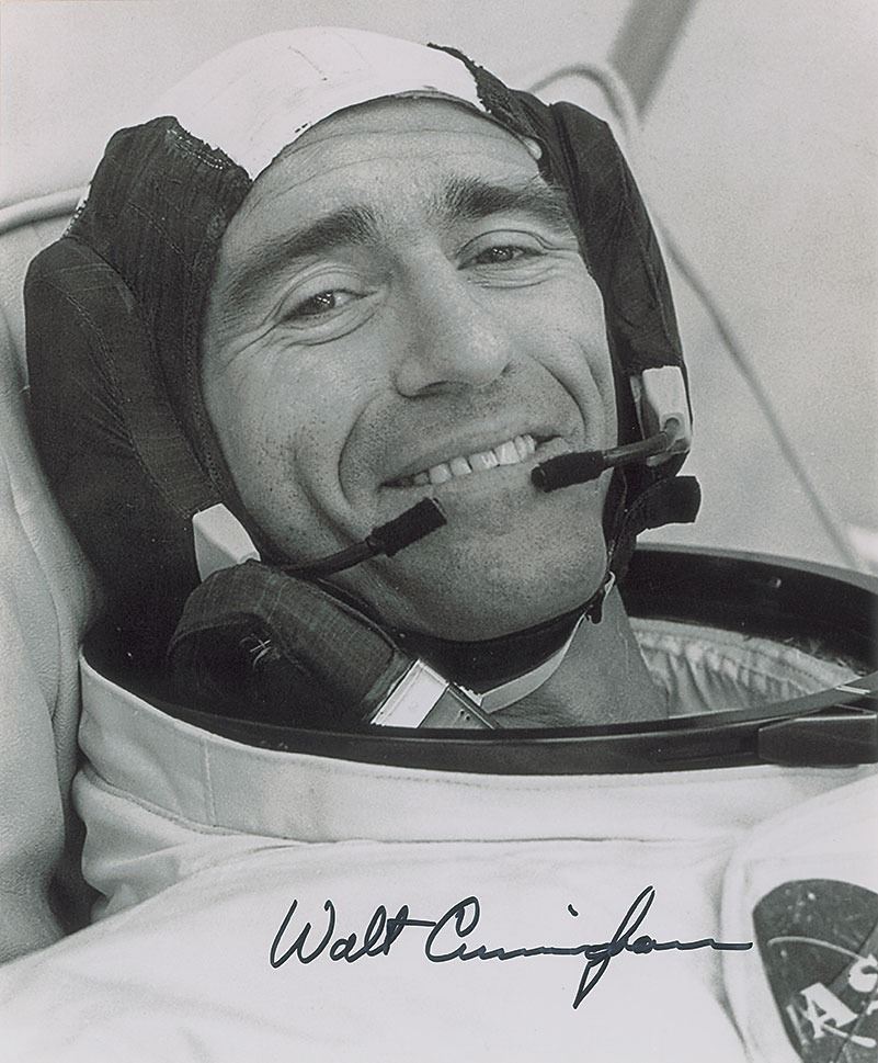 Semi-glossy 8 x 10 close-up photo of the Apollo 7 lunar module pilot smiling in his space suit, signed in black felt tip by Walt Cunningham. In fine condition.