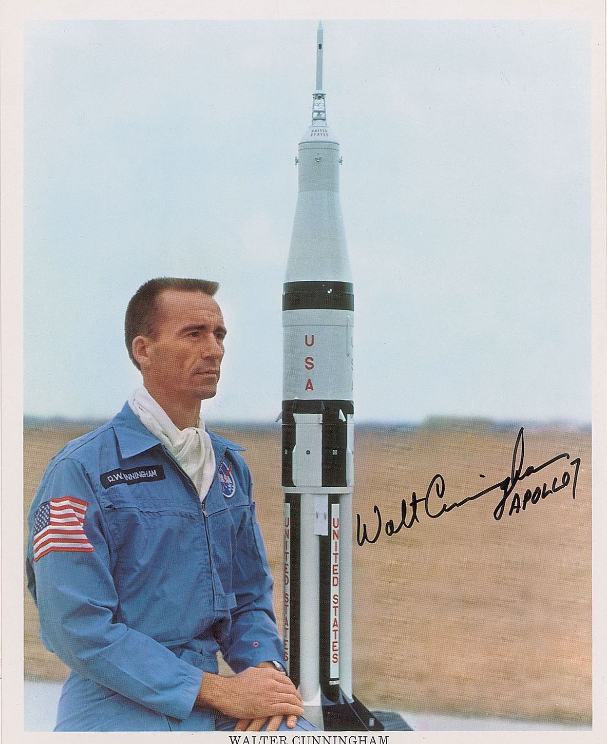 Official color 8 x 10 NASA lithograph of Cunningham posing with a large model of the Saturn V, signed in black felt tip, "Walt Cunningham, Apollo 7." In fine condition, with a few light surface creases.
