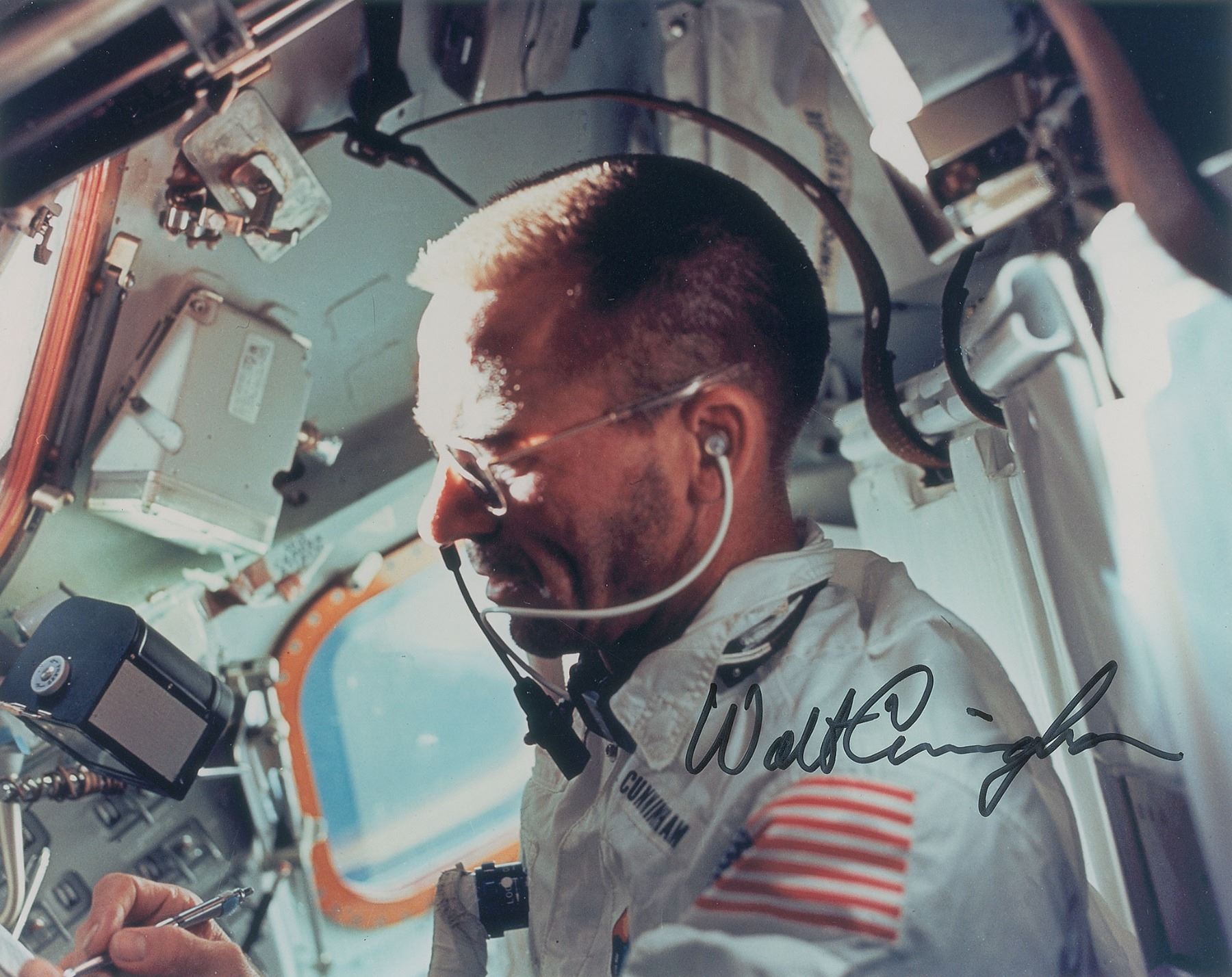 Color satin-finish 10 x 8 photo of Walt Cunningham taking notes inside the CSM during the Apollo 7 mission, signed in black felt tip. In very fine condition.
