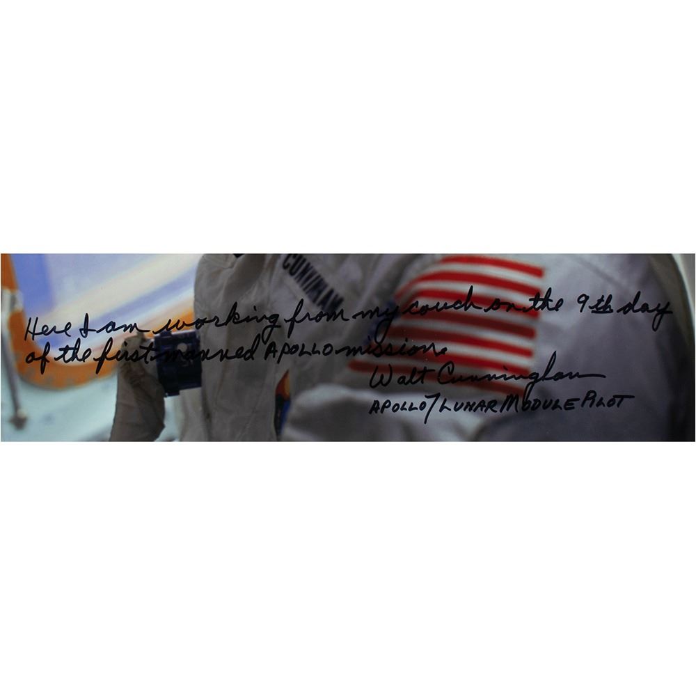 Color satin-finish 20 x 16 close-up photo of LMP Cunningham jotting down notes inside the Apollo CSM-101 spacecraft during the Apollo 7 mission, signed in black felt tip, "Here I am working from my couch on the 9th day of the first manned Apollo mission. Walt Cunningham, Apollo 7 Lunar Module Pilot." In fine condition.