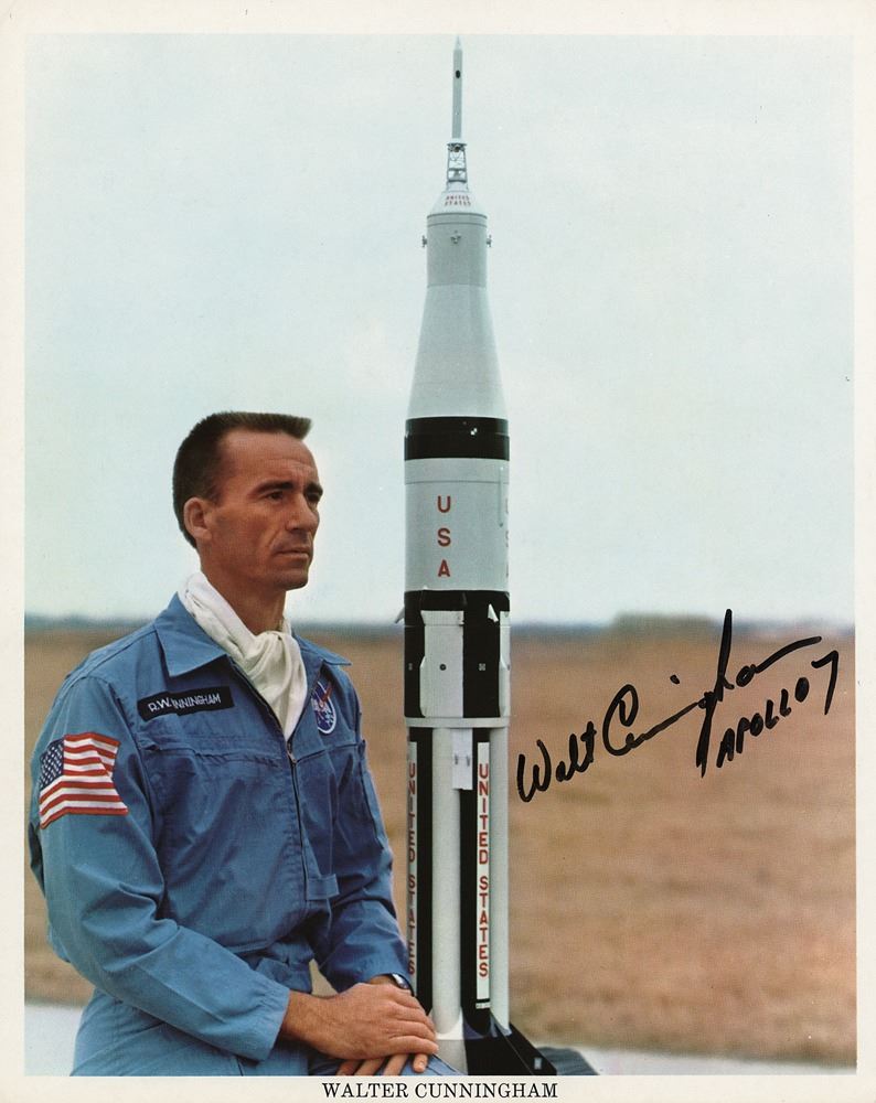 Official color 8 x 10 NASA lithograph of Cunningham posing beside a model of the Saturn V, signed in black felt tip, "Walt Cunningham, Apollo 7." In very fine condition.