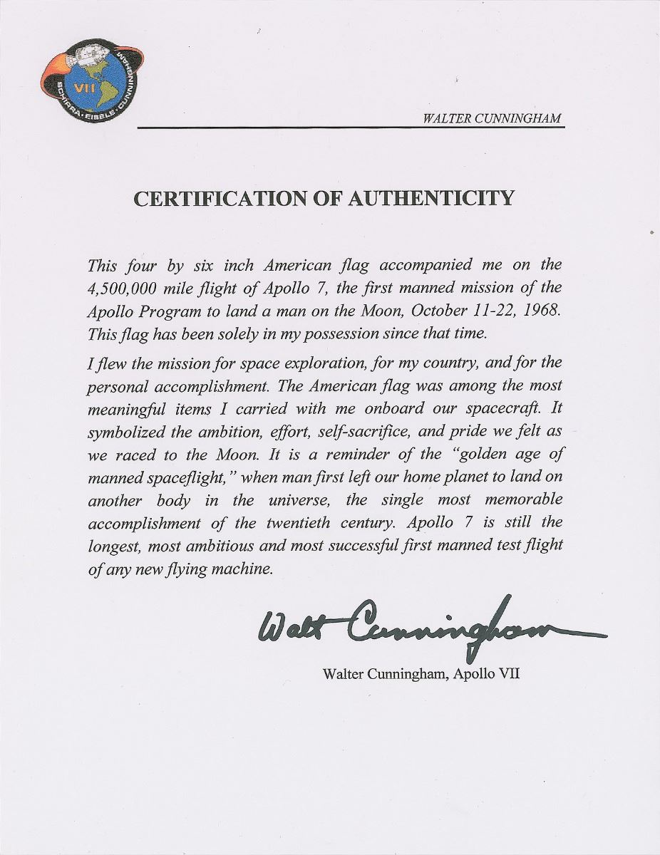 Flown American flag carried aboard Apollo 7, 6 x 4, affixed to a 10 x 12 presentation sheet with the text, “This flag was carried aboard the first manned Apollo spacecraft, Apollo VII, October 11–22, 1968, Schirra—Eisele—Cunningham,” with an affixed photo of the crew on the deck of the recovery ship USS Essex. In fine condition. Accompanied by a signed certificate of authenticity from Cunningham, in part: “This four by six inch American flag accompanied me on the 4,500,000 mile flight of Apollo 7, the first manned mission of the Apollo Program to land a man on the Moon, October 11–22, 1968. The flag has been solely in my possession since that time.” Also accompanied by the original mailing envelope.