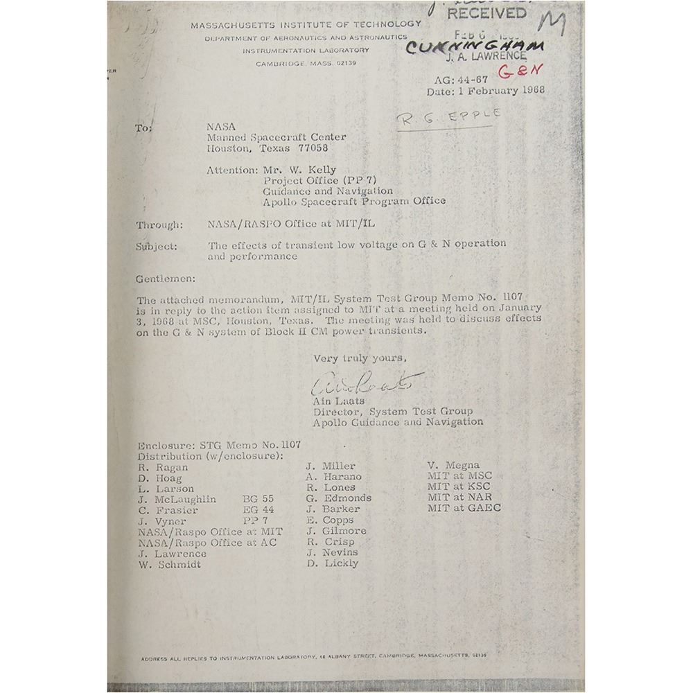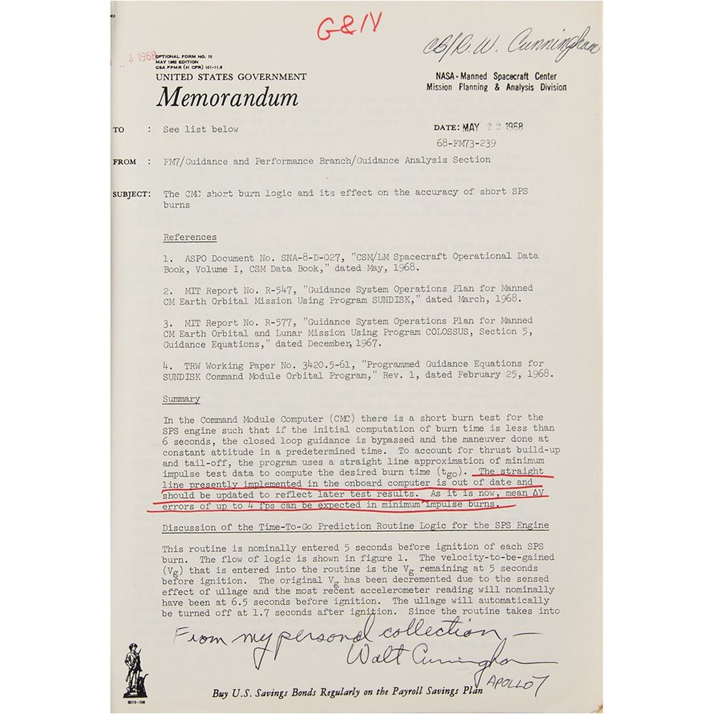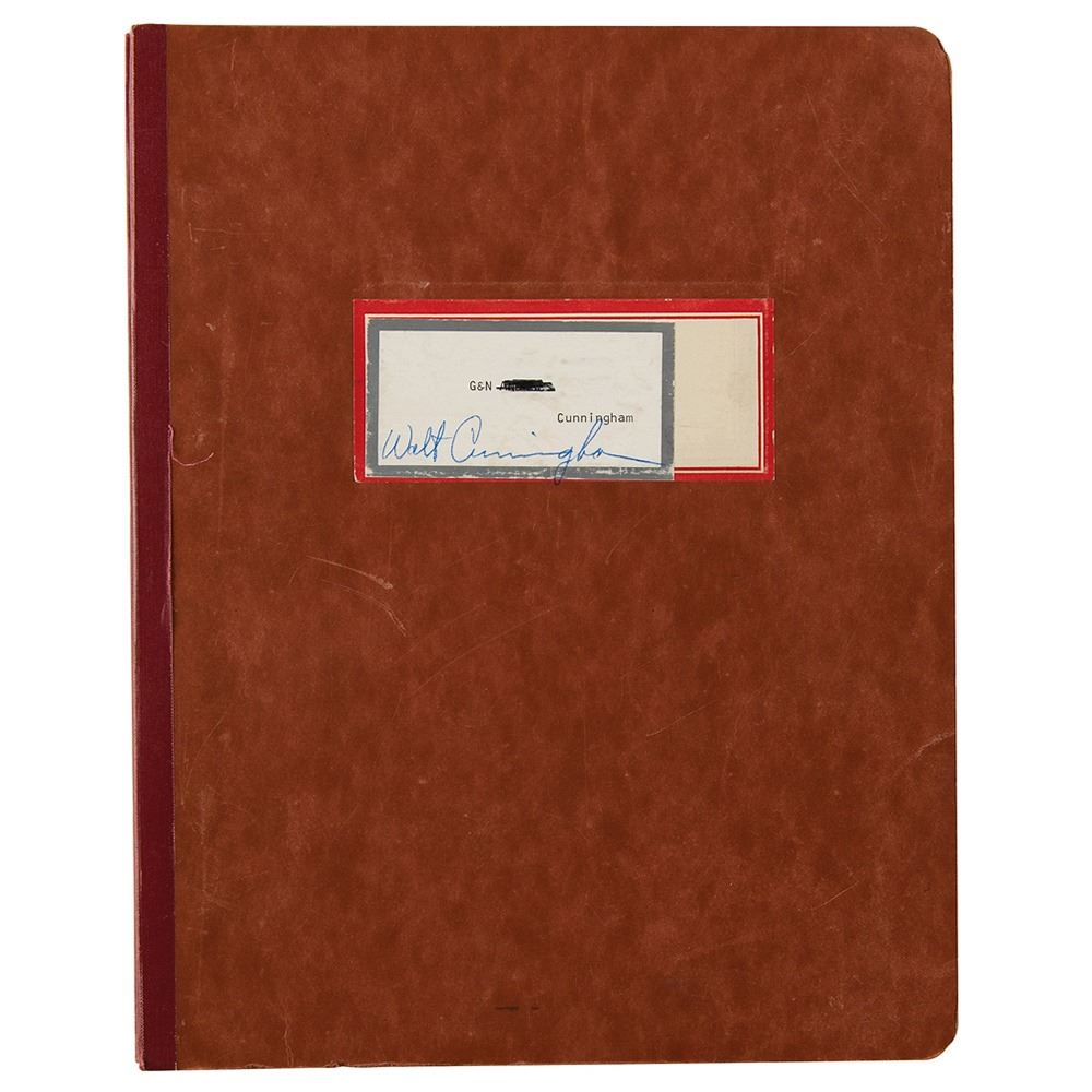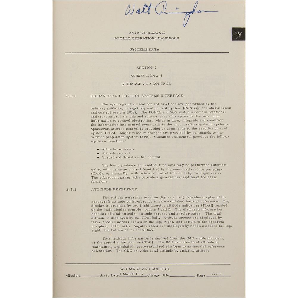Walt Cunningham‰Ûªs bracket-bound portfolio containing various documents that he used in 'Guidance and Navigation' training for the Apollo 7 mission, 9 x 11.5, signed twice in ballpoint, ‰ÛÏWalt Cunningham,‰Û on the front cover "G&N" label and at the top of an Apollo Operations Handbook section, and then a third time on the opening memorandum sheet, stating: ‰ÛÏFrom my personal collection‰ÛÓWalt Cunningham, Apollo 7.‰Û The memorandum sheet, NASA-Manned Spacecraft Center, Mission Planning & Analysis Division, dated May 22, 1968, sent from ‰ÛÏFM7/Guidance and Performance Branch/Guidance Analysis Section,‰Û is annotated ‰ÛÏG&N‰Û and features the subject line: ‰ÛÏThe CMC short burn logic and its effect on the accuracy of short SPS burns.‰Û The signed Apollo Operations Handbook section, ‰ÛÏSM2A-03-Block II,‰Û is for ‰ÛÏSection 2,‰Û which relates to Guidance and Control. The portfolio also includes the article ‰ÛÏNavigation‰Û by Gerald M. Levin, and sundry technical packets from the Apollo M.I.T. Instrumentation Laboratory, with a few pages bearing handwritten notations. The spine is marked in felt tip, "G & N." In fine condition.