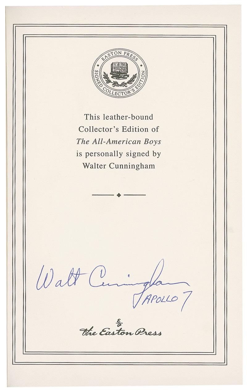 Signed book: The All-American Boys. Collector’s edition. Norwalk: Easton Press, 1999. Leather-bound hardcover, 6.25 x 9.5, 474 pages. Signed in blue ballpoint on a specially printed prefatory page, “Walt Cunningham, Apollo 7.” In very fine condition.