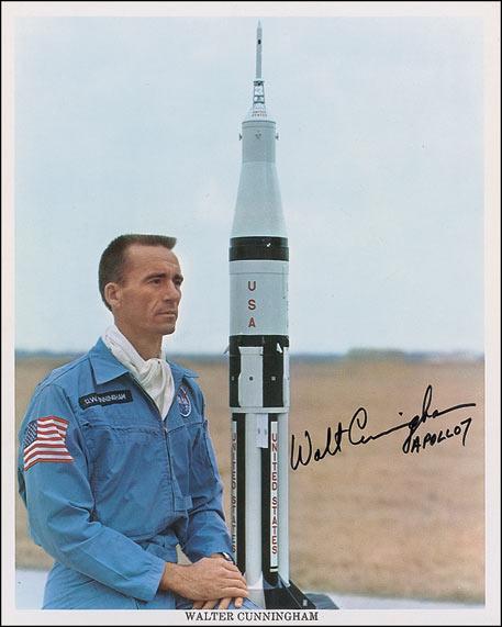 Color 8 x 10 NASA photo of Cunningham posing next to a model of the Saturn V, signed in black felt tip, “Walt Cunningham, Apollo 7.” In fine condition.