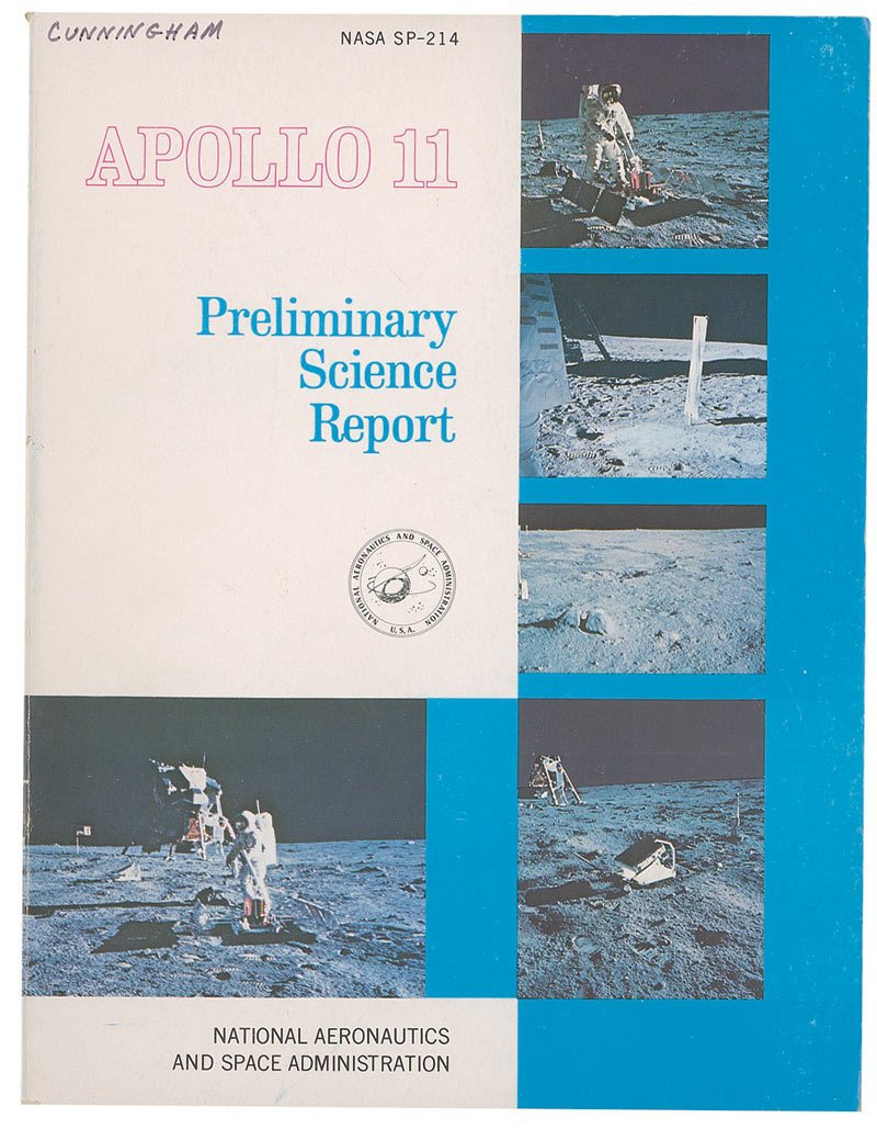Apollo 11 Preliminary Science Report, issued by NASA’s Scientific and Information Division, 8 x 10.5, 204 pages. Report is full of photos and explanations of the mission, and is stamped on the front cover “NASA SP-214.” Signed on the title page in blue felt tip, “From my personal library collection. Walt Cunningham Apollo 7.” In fine condition, with expected handling wear. These reports were issued by NASA as soon as possible after missions to release initial information quickly for research and discussion.