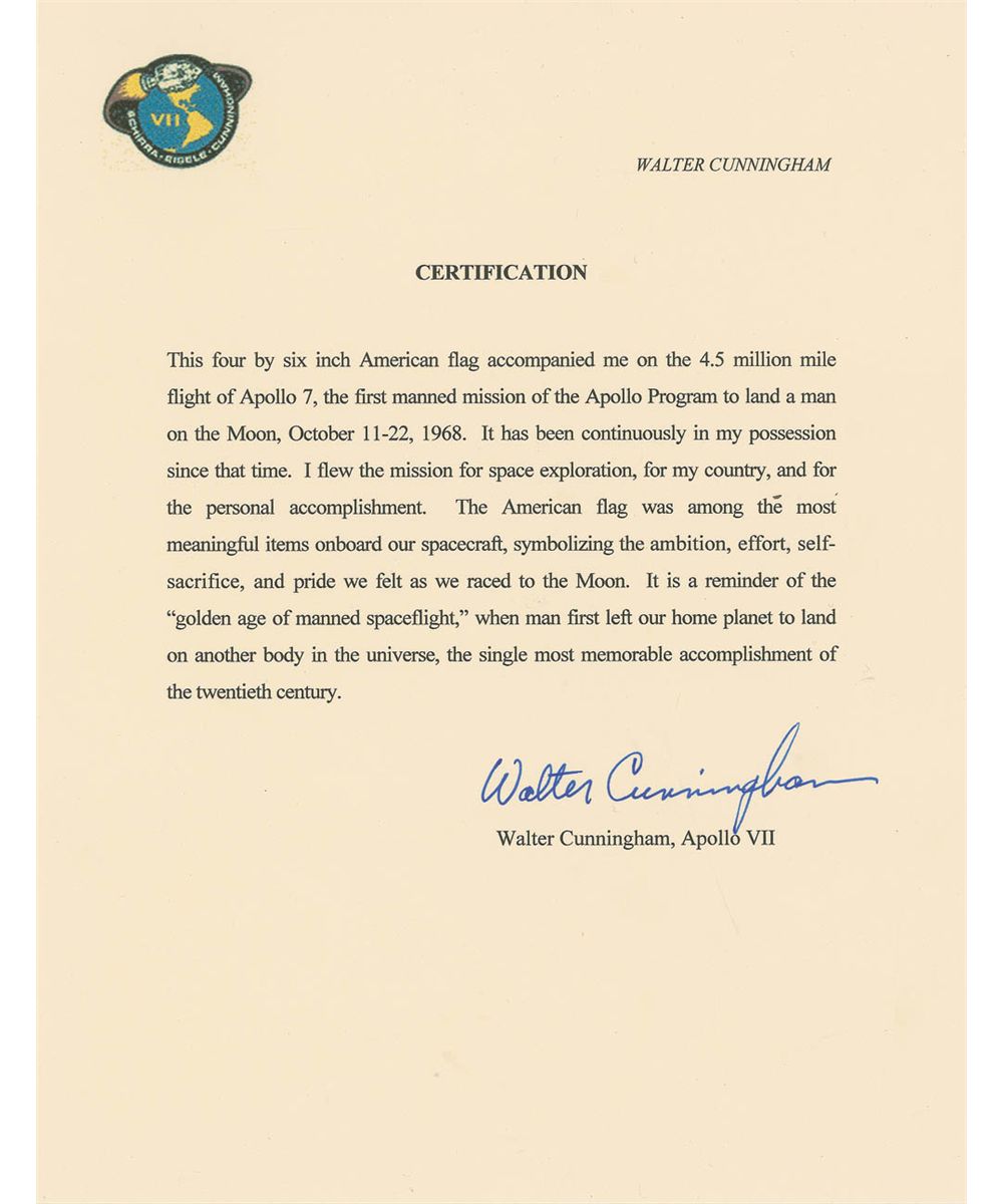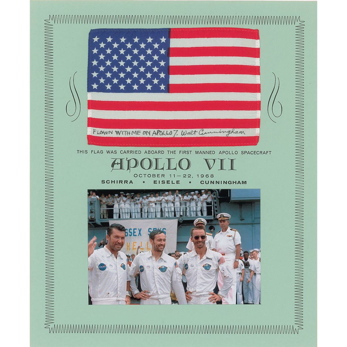 Flown printed fabric American flag, 6 x 4, flown aboard Apollo 7, the first manned Apollo mission. Flag is signed on a white stripe in black felt tip, “Flown with me on Apollo 7. Walt Cunningham.” Flag is affixed by its corners to a 10 x 12 presentation mount, along with a color image of the mission’s crew, with a printed statement reading, “This flag was carried aboard the first manned Apollo spacecraft Apollo VII. October 11–22, 1968. Schirra-Eisele-Cunningham.” Accompanied by a letter of authenticity from Cunningham. In fine condition.