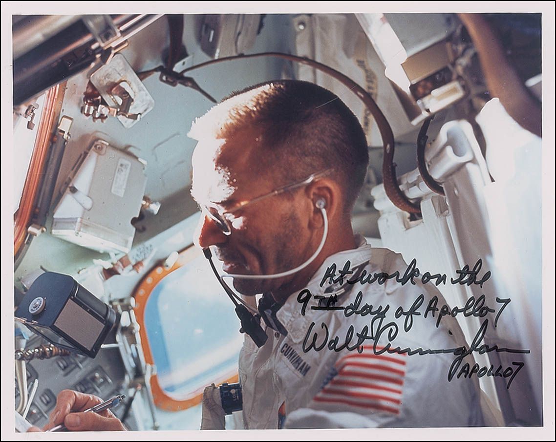 Color satin-finish 10 x 8 photo of Cunningham during the Apollo 7 mission, signed in black felt tip, “At work on the 9th day of Apollo 7, Walt Cunningham.” In very fine condition.