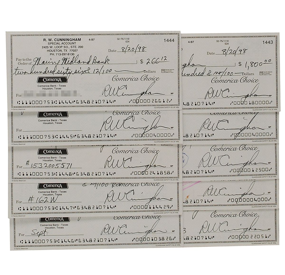 Twenty personal checks, all 6 x 2.75, all from 1998, and all filled out and signed by Cunningham, “R. W. Cunningham.” In overall fine condition.
