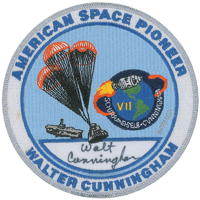 Patch honoring Cunningham as an American Space Pioneer and bearing the Apollo 7 mission insignia, 5? in diameter, signed at the bottom in black felt tip by Cunningham. In fine condition, with slight feathering to signature.