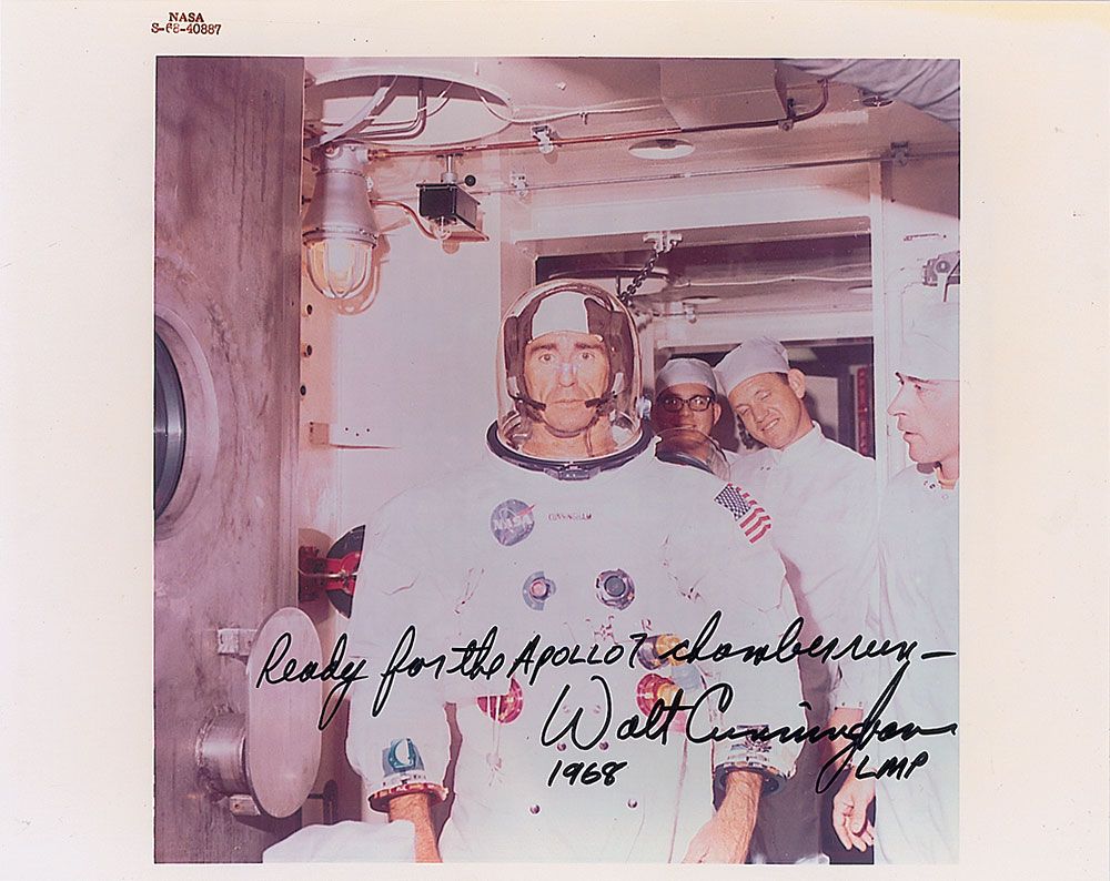 Color glossy 10 x 8 second-generation ‘red-numbered’ NASA photo of Cunningham during training, signed in black felt tip, “Ready for the Apollo chamber run—Walt Cunningham, 1968, LMP.” In very fine condition.