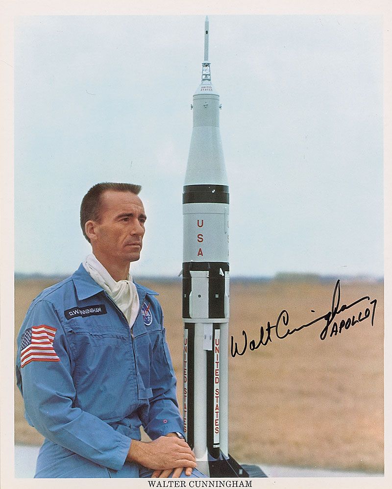 Color 8 x 10 NASA photo of Cunningham next to a Saturn V model, signed in black felt tip, “Walt Cunningham, Apollo 7.” In fine condition.