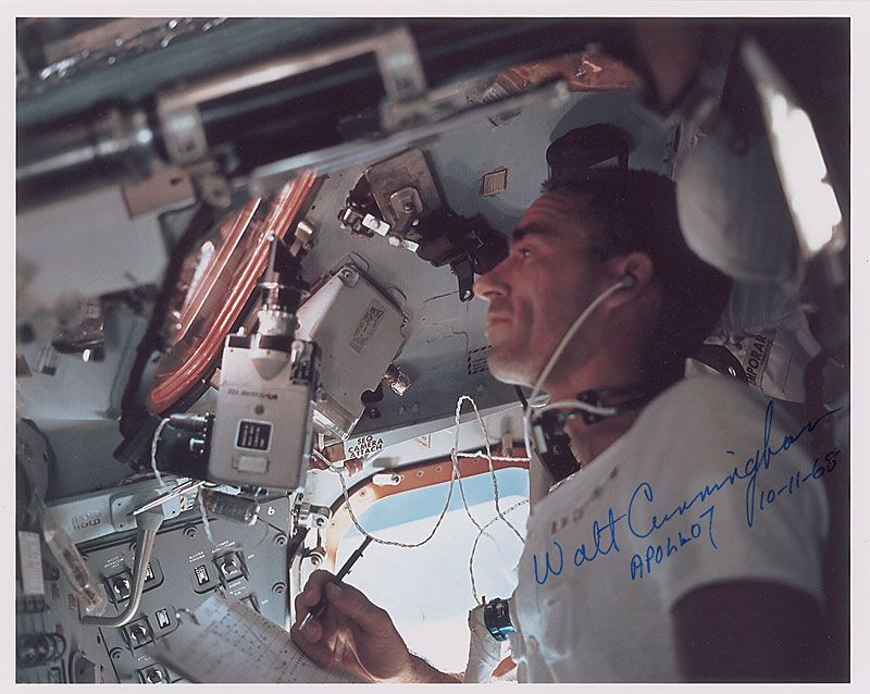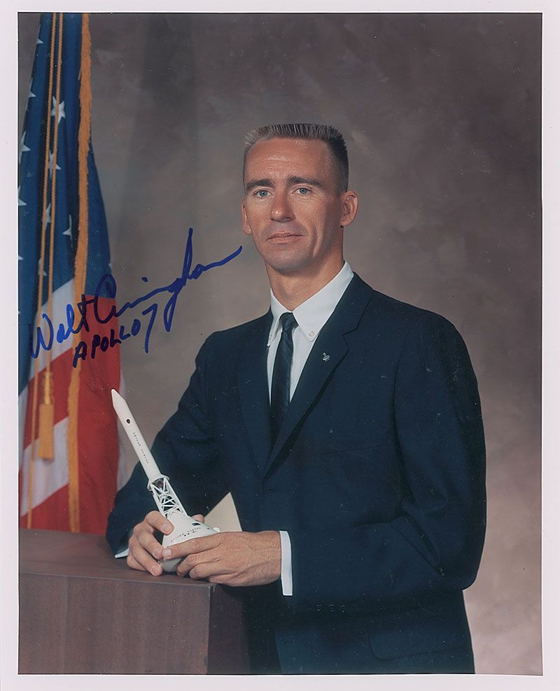 Two color satin-finish photos, one 8 x 10 and one 10 x 8, including one of Cunningham during the Apollo 7 mission, each signed in blue felt tip. In very fine condition.
