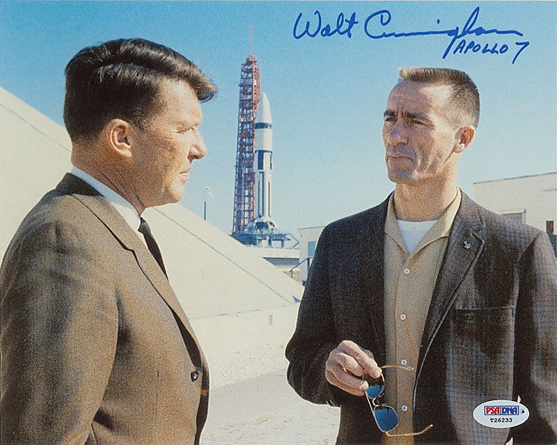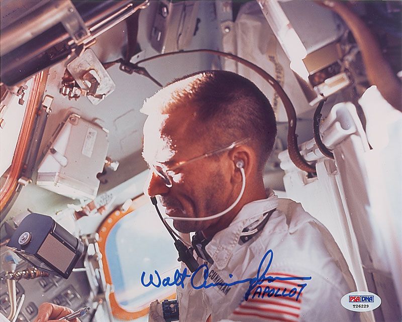 Two different color satin-finish 10 x 8 photos, each signed in blue felt tip, “Walt Cunningham, Apollo 7.” In fine condition, with a PSA/DNA authentication label affixed to lower corner of each photo. Accompanied by certificates of authenticity from PSA/DNA.