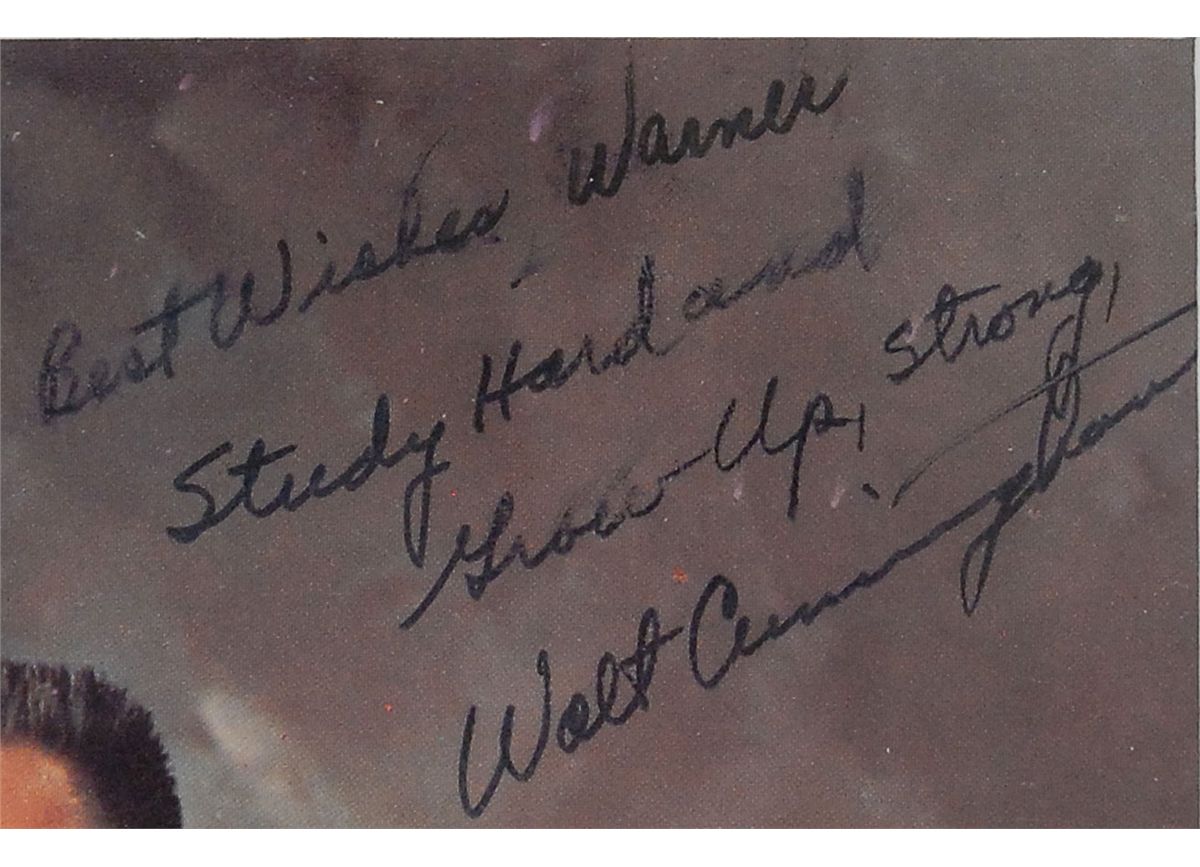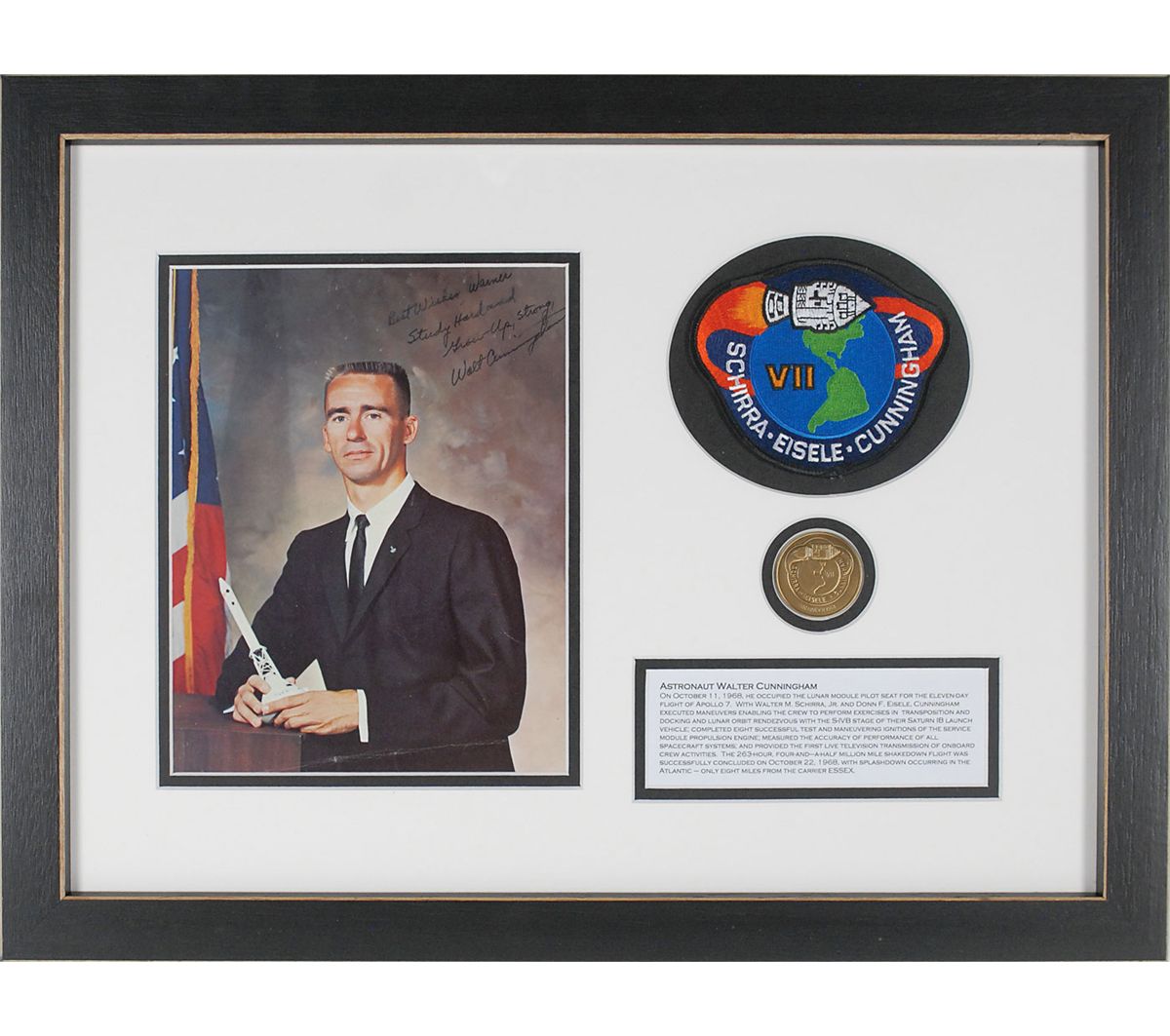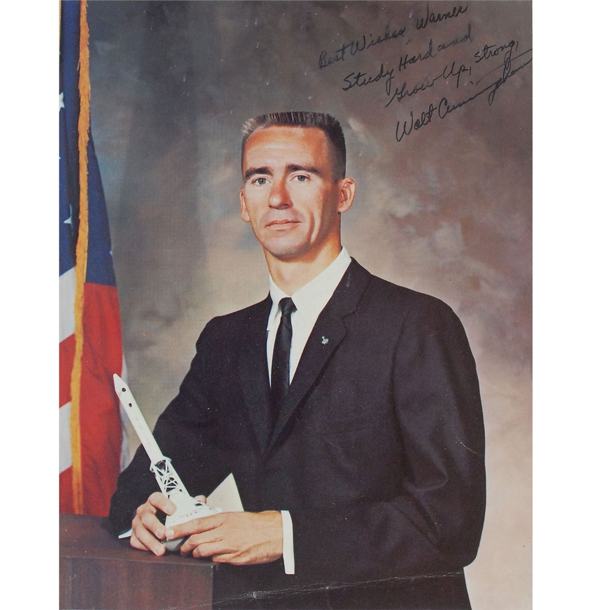 Color official NASA 8 x 10 lithograph of Cunningham holding a model of a capsule, signed and inscribed in black felt tip, “Best wishes Warner, study hard and grow up strong, Walt Cunningham.” Double-matted and framed with an Apollo 7 mission patch, medallion, and a printed biography to an overall size of 20.75 x 16. A few scattered creases, otherwise fine condition.