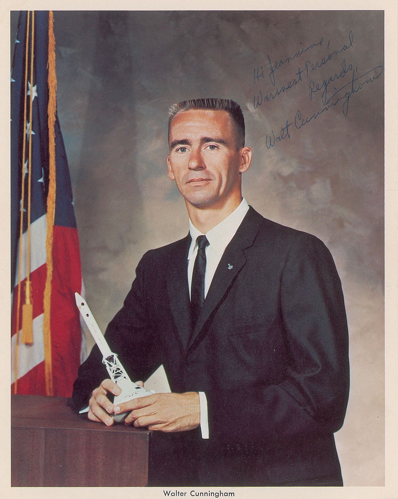 Official color 8 x 10 NASA lithograph of Walt Cunningham posing with a capsule model, his lapel bearing an astronaut pin, signed and inscribed in blue ballpoint, "Hi Jeannine, warmest personal regards, Walt Cunningham.” In very fine condition. Recipient was an employee at the Los Angeles International Airport who assisted astronauts with picking up their GSA vehicles circa 1967.