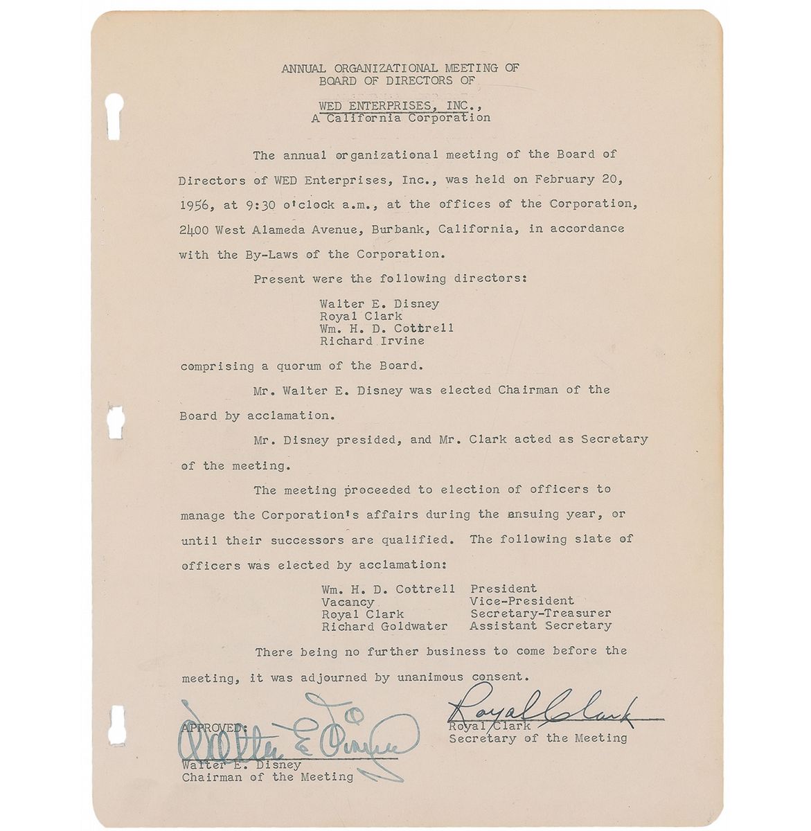 DS, signed “Walter E. Disney,” one page, 8.5 x 11, February 20, 1956. Minutes of the 1960 annual meeting of the shareholders of WED Enterprises, Inc. In part: “Mr. Walter E. Disney was elected Chairman of the Board by acclamation. Mr. Disney presided, and Mr. Clark acted as Secretary of the meeting. The meeting proceeded to election of officers to manage the Corporation’s affairs during the ensuing year.” Signed at the conclusion by Disney as chairman, and countersigned by Royal Clark as secretary. In fine condition. Disney founded the company in 1952, lending his initials to its name, in order to fund and oversee the development of Disneyland. He provided the startup money for the park from his own personal fortune, funneled through WED Enterprises. The company would be renamed Walt Disney Imagineering in the 1960s.