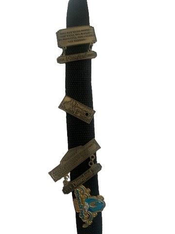 A collectible Disneyland lanyard celebrating 45 years at Disneyland from the year 2000. Includes seven collectible pins to celebrating 45 years of magic one with Tinker Bell and the the year 2000, A vintage Disneyland ticket replica showing it was for one dollar and two replicas of Disneyland signs. One says here you leave today and enter the world of yesterday, tomorrow and fantasy. The second sign pin says Partners: “I think most of all what I want Disneyland to be is a place where parents and children can have fun together.” Walt Disney. The last pin is of some characters trailing a carriage on a cloud.