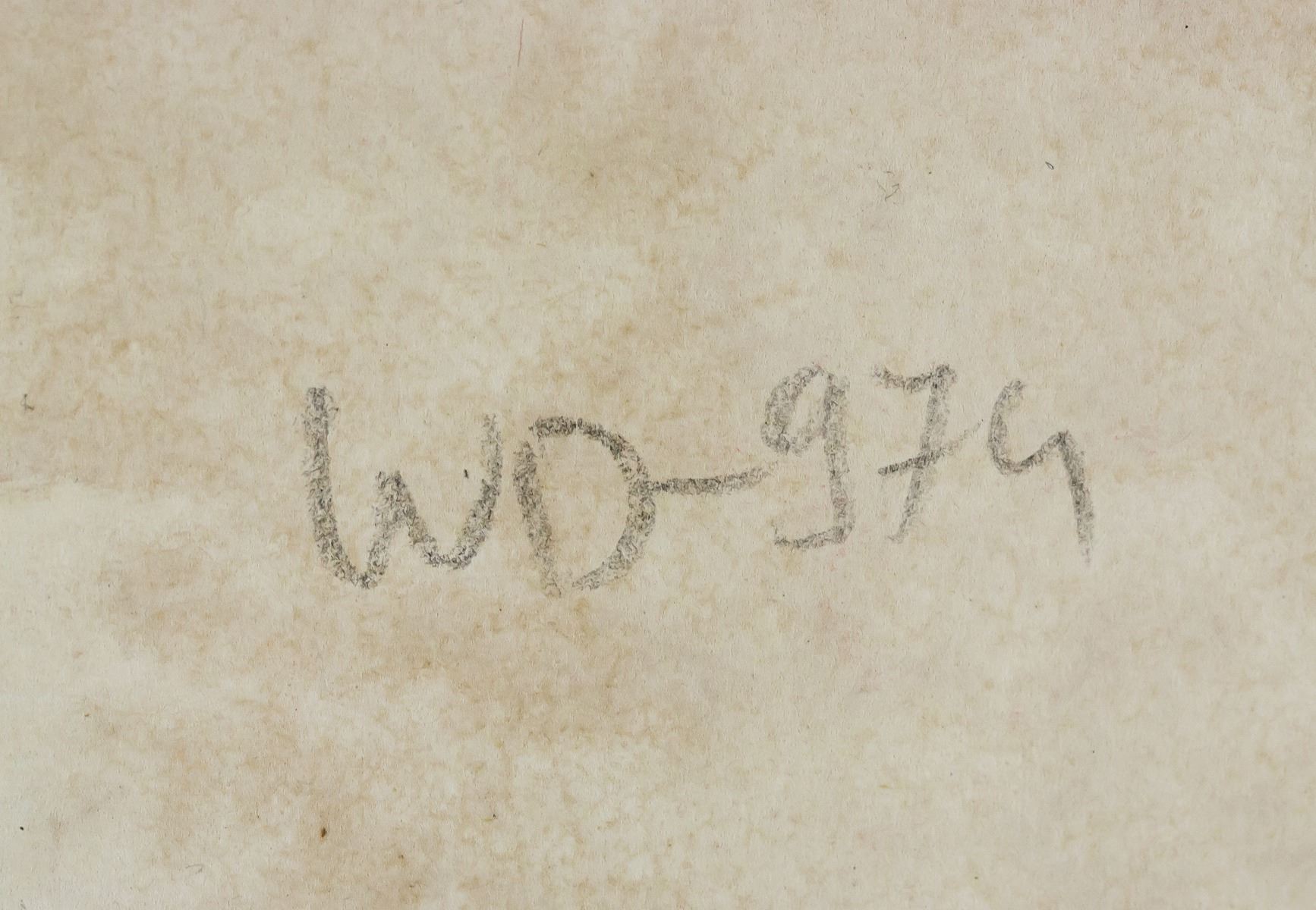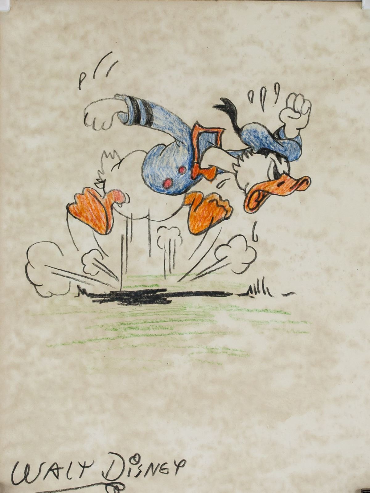 Crayon on paper. Featuring a portrait of a Donald Duck. Signed WALT DISNEY on the lower left corner. Stamped ORIGINAL on verso. Stamped Property of Walt Disney Productions. Inscribed WD-979 on verso. Attributed to Walt Disney (1901-1966, American). 26 x 20 cm 910.25 x 7.75 inches)